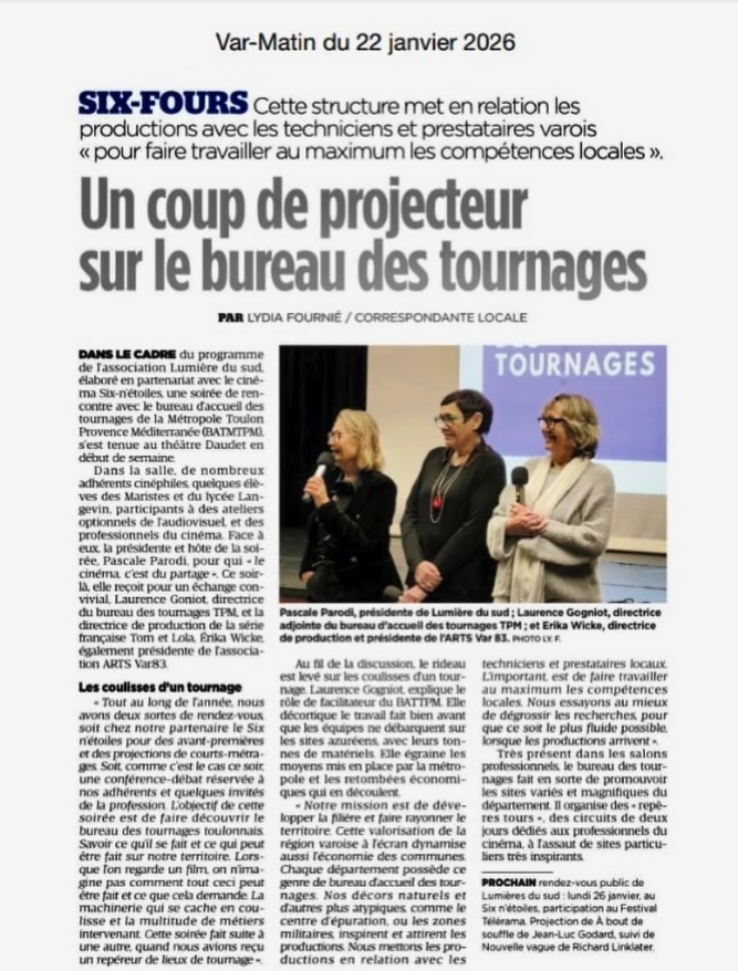 Ces projections mensuelles sont organisées dans le cadre d’une programmation culturelle régulière, enrichie de partenariats avec le cinéma Six n’étoiles et la ville de Six-Fours, notamment lors d’événements marquants comme la Journée internationale des droits des femmes.